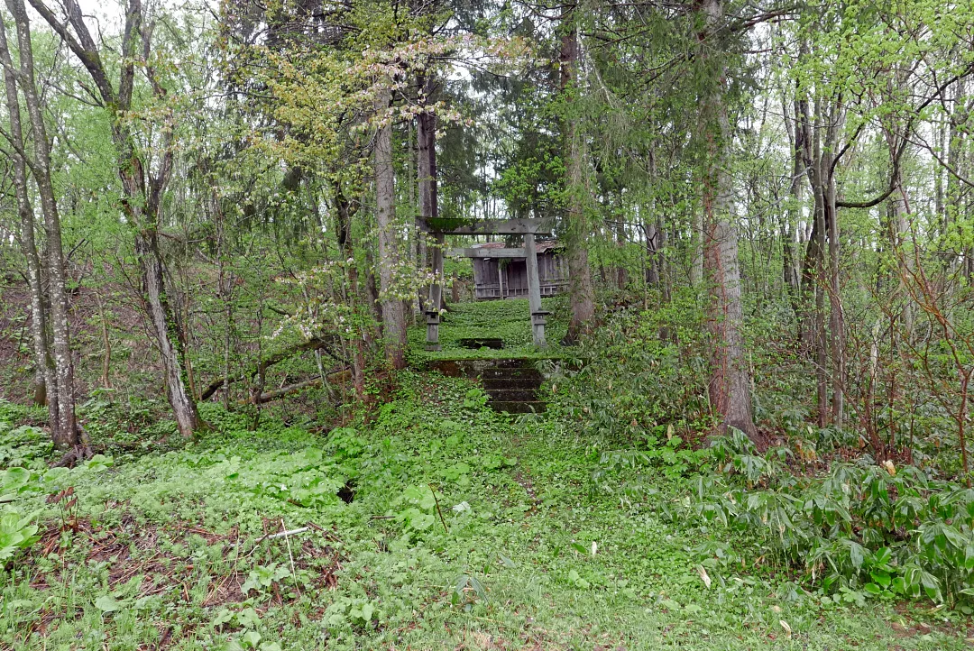 道なりに400mほ進むと舗装が途切れで行き止まりに。その前方の林の中に鎮座します。