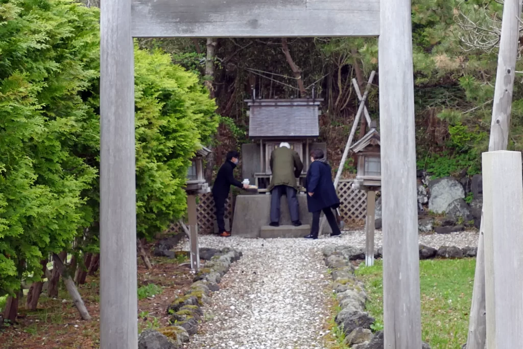 お祭りの概要は、長老の方が祝詞をいくつか奏上し、祝詞と祝詞の間に、参加者が一人一人祠の前で参拝をしました。