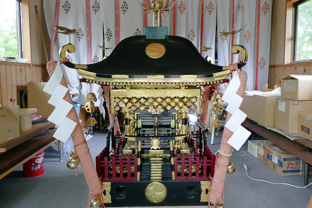 社殿の右手前に神輿殿。色合いなど雰囲気が社殿に似ています。