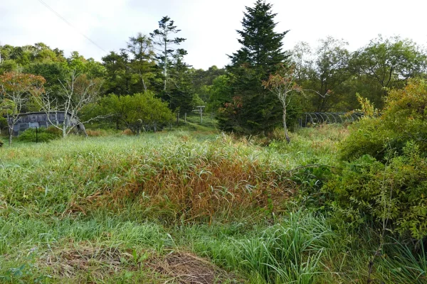 よく見ると草むらの向こうに鳥居らしいものが見えます。