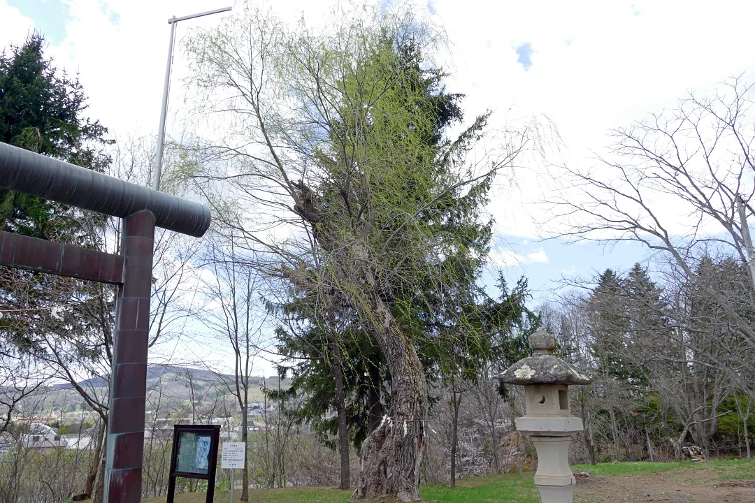 鳥居の横に建つ巨木は保存樹木「シダレヤナギ」